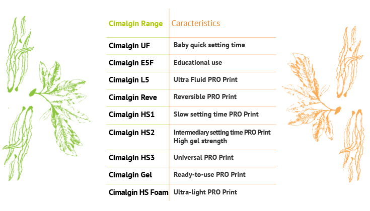 The MOULDING ALGINATES of the CIMALGIN range are dedicated to specific applications in Fine Arts, hobbies & edutainment and catering industries. They are complex mixes, based with natural extracts of brown seaweeds (sodium alginate). Thanks to their specifications, the alginates formulated by Cimaprem Moulding meet the expectations of all the professionals and are developed with the advice of expert users.