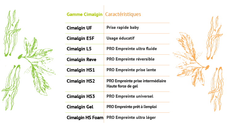 Cimaprem Moulding formule un alginate de moulage sur mesure en ajustant la qualité du détail, la texture, le temps de prise, la dilution et la thixotropie, permettant une variété de protocoles et de réalisations des plus classiques aux plus innovants.